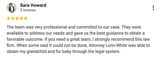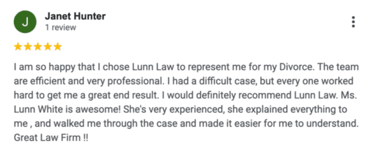 “I am completely satisfied with the services that Lunn Law provided. The Law Office is prompt, efficient, and gets the job done.”, “Very pleased. Questions were answered in a timely manner. Very patient and understanding. Awesome representation!”, “Attorney Lunn-White is an excellent attorney who goes above and beyond for her clients. She has a stellar reputation within the legal community. I highly recommend her services!”, “I used this law firm to assist in my legal case, and Attorney Tiffany Lunn-White was so attentive to me, I felt that she really cared and I wasn’t just a Number. The staff there is amazing especially her assistant Robin. They kept me updated every step of the way. I would truly recommend this firm to everyone! They get RESULTS!”, “I’m very thankful to Lunn Law LLC and team for the work that they have done for me with my Divorce case, the time frame that was given was precise, the teammates where very professional, kind and very much understand with what I had going on, there are my top Divorce law firms in GA and will recommend them to anyone in need, Thanks again TEAM”